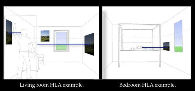 It was also the day my consulting and residential design clients started to benefit from the merits of the HLA approach to picture hanging – a technique that honors the perceiver while also providing a ‘virtual window’. Think of the possibilities for those window-less office cubicles and hospital rooms, or for transforming a boring ‘room’ into an enriching ‘space’.