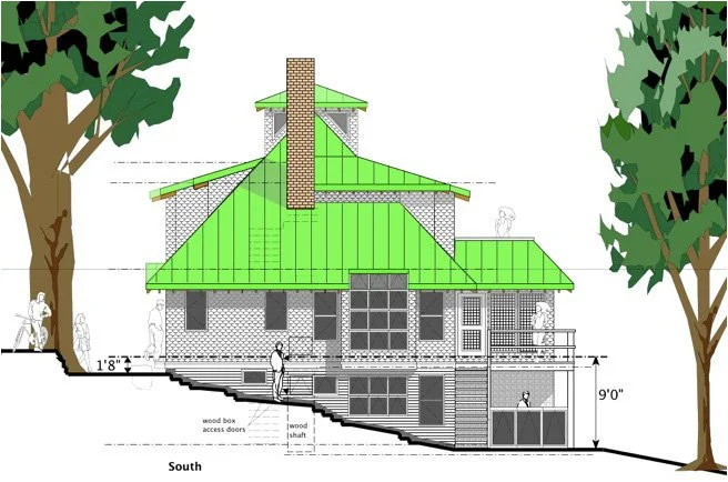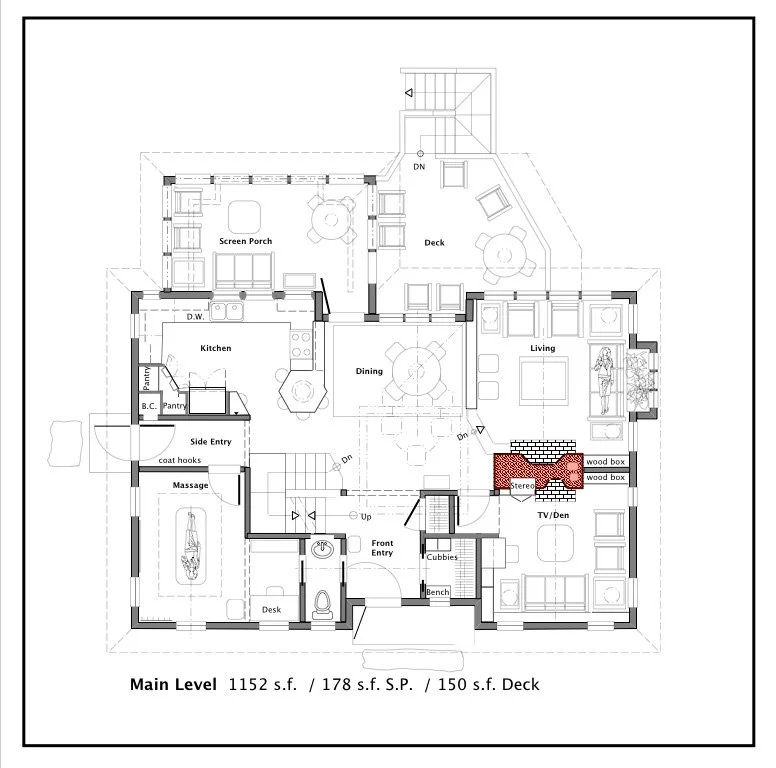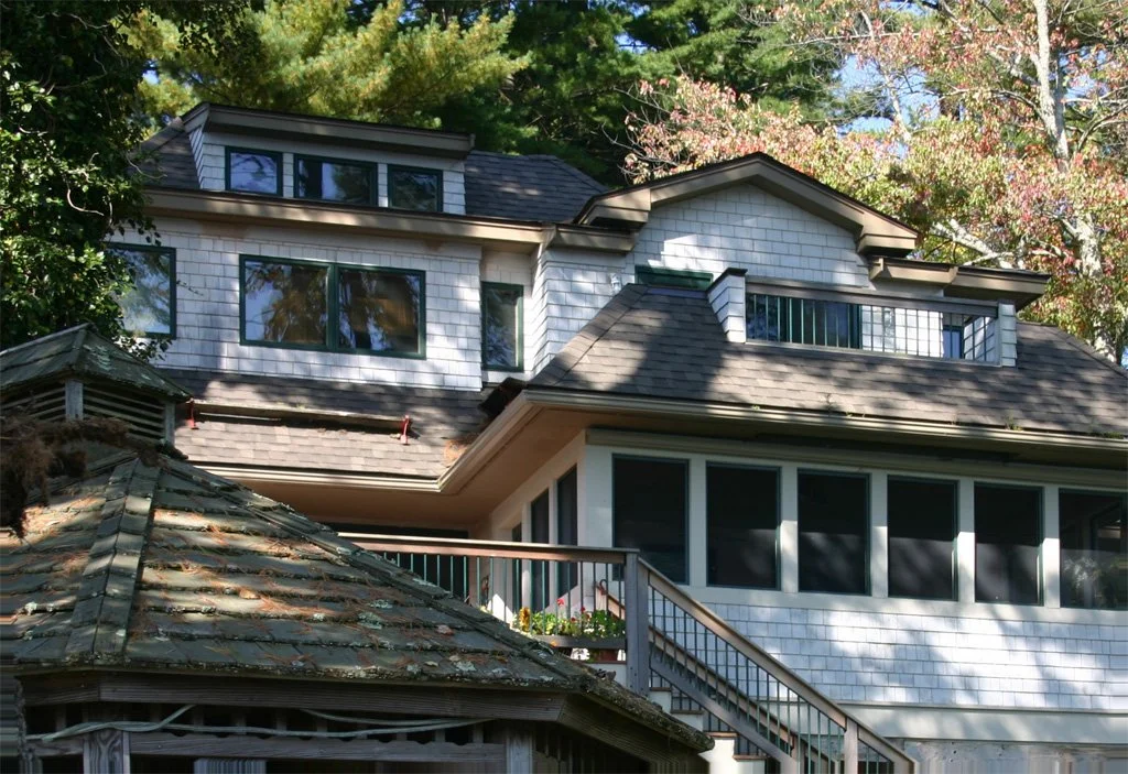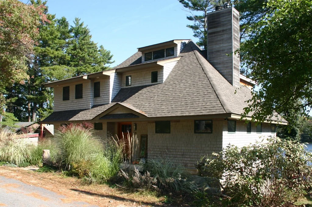 DESCRIPTION: Unable to salvage an existing rundown cottage on a small lake side parcel of land, the main focus of this project for a family of four was preserving as much lake side land as possible while taking advantage of the Easterly views of the lake from a daylight basement, first and second floors, and a third level retreat. Complimenting the open kitchen, dining and living room layout on the first floor were an enclosed massage room, den and guest bath. A lower level family room with direct access to the lake was complimented with a darkroom, stain glass studio, and a guitar studio.
